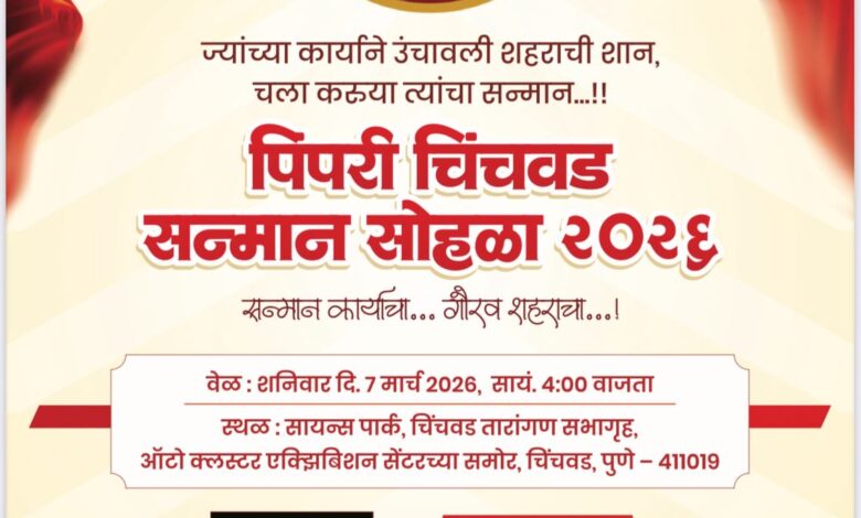 पिंपरी (लोकजागृती )पिंपरी-चिंचवड शहरातील विविध क्षेत्रांमध्ये उल्लेखनीय कार्य करणाऱ्या मान्यवरांना तिसऱ्या “पिंपरी चिंचवड सन्मान – २०२६” पुरस्काराने गौरविण्यात येणार आहे. समाजजीवन, कला, साहित्य, पर्यावरण, क्रीडा, शेती आणि शैक्षणिक क्षेत्रात मोलाची कामगिरी करणाऱ्या व्यक्तींना यंदा सन्मानित करण्यात येणार असल्याची माहिती आयोजकांनी दिली.
